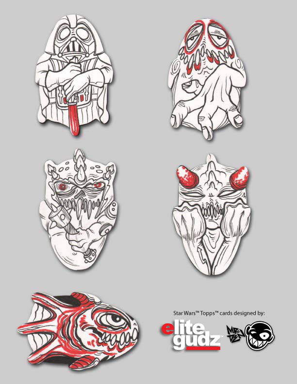 Elite Gudz announces that their artists Rolo Ledesma and Mr. Den have contributed original shaped sketch cards to the Topps Star Wars Galaxy 5 trading card set, available in stores now.